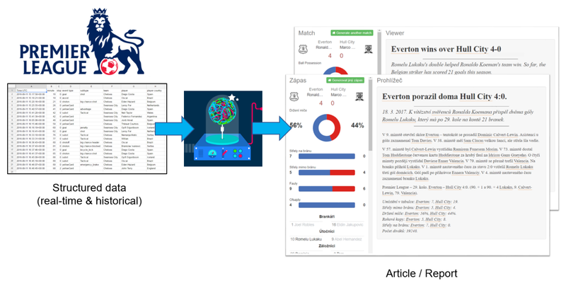 Na následujícím obrázku můžeme vidět, jak zhruba pracuje dosavadní robotický žurnalista. Vezme „strukturovaná data (aktuální i historická)”, která následně překlopí do článku. Může jít třeba o fotbalovou ligu. Výsledný titulek vypadá například takhle: „Everton porazil doma Hull City 4:0.” A pokračujme perexem: „18. 3. 2017. K vítězství svěřenců Ronalda Koemana přispěl dvěma góly Romelu Lukaku, který má po 29. kole na kontě 21 branek.”