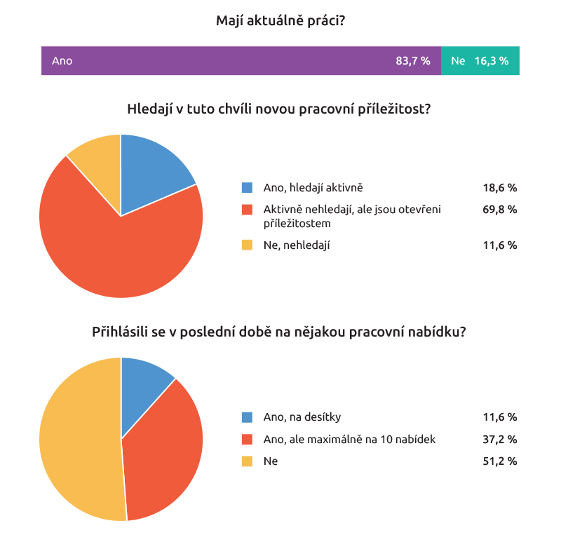 Téměř pětina z nich odpověděla, že aktuálně aktivně hledá práci, jedna desetina uvedla, že odpověděla na desítky inzerátů, 37 procent odpovědělo, že v poslední době reagovalo na nějakou pracovní nabídku, ale nebylo to víc jak v deseti případech. Polovina neodpověděla na nic.