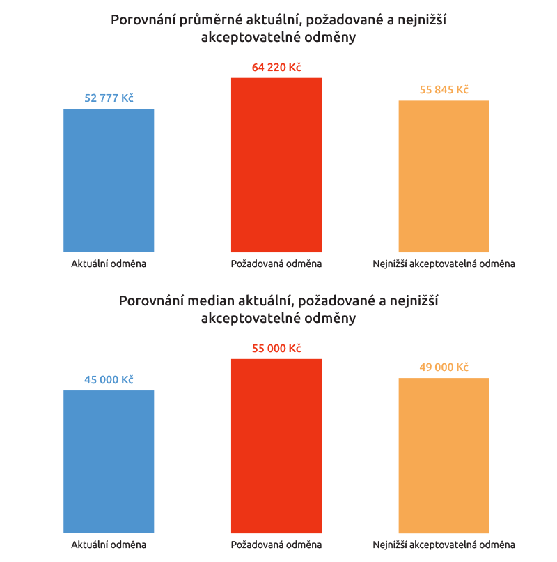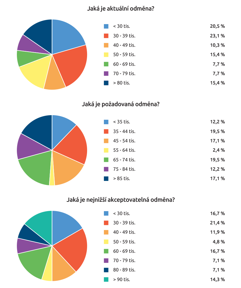 Při bližším pohledu na odměny zjistíme, že největší podíl (23,1 procenta) je těch, kteří aktuálně berou mezi 30 a 39 tisíci korun, což je zároveň rozmezí, které nejvíce z nich (21,4 procenta) uvedlo jako nejnižší přijatelné pro měsíční mzdu. V otázce požadované odměny se stejný podíl (19,5 procenta) vyslovil pro rozmezí od 35 do 44 tisíc korun a od 65 do 74 tisíc korun.