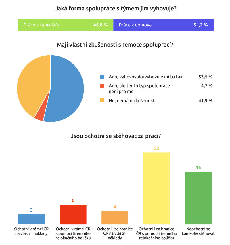 Mírná většina (51,2 procenta) se tentokrát vyslovila pro práci z domova, přičemž více než polovina zpovídaných uvedla, že již takovou zkušenost má a byla s ní spokojena. V další otázce s více možnostmi se ukázalo, že 22 lidem by nevadilo se za prací stěhovat i za hranice ČR, pokud by měli nárok na firemní relokační balíček, druhá nejpočetnější skupina je těch, kdo nejsou ochotni se stěhovat vůbec.