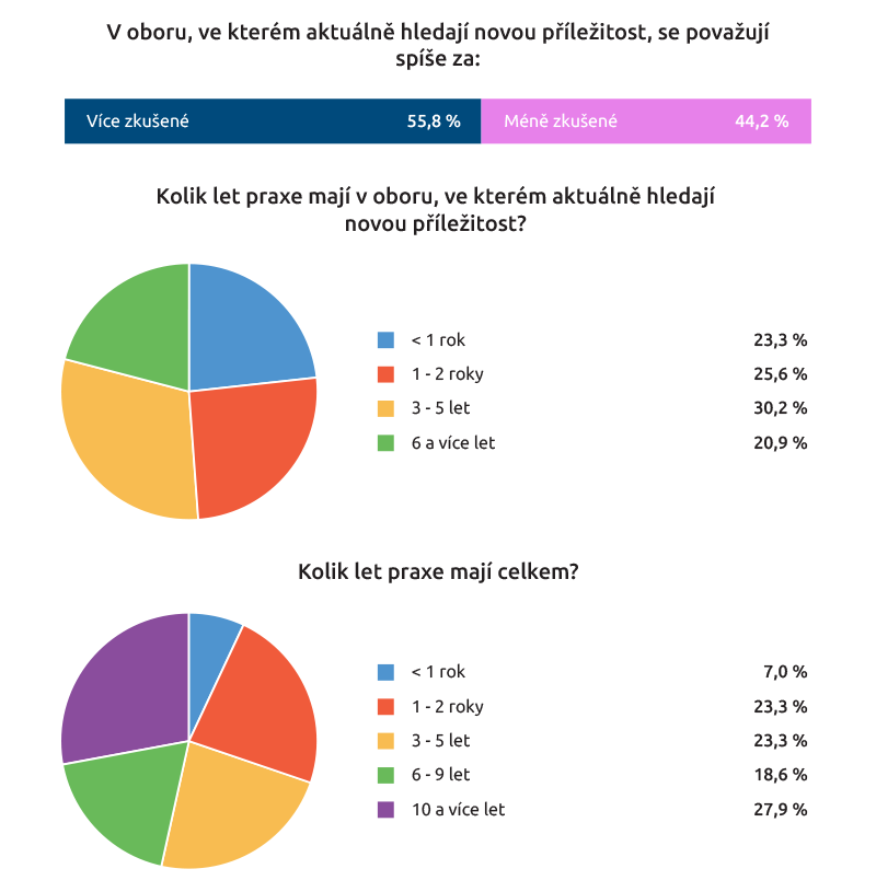 Co se týče dosažené praxe, nejvíce je mezi respondenty těch, kteří mají 3 až 5 let praxe v daném oboru a zároveň 10 a více let pracovní praxe celkem. Většina (55,8 procenta) se považuje za více zkušené.
