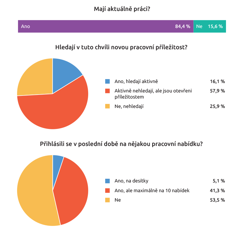 Většina z respondentů (84 procenta) má v současné chvíli práci, 58 procent nicméně uvádí, že sice aktivně práci nehledají, ale jsou otevřeni příležitostem. 16 procent pak hledá aktivně a 26 nehledá vůbec.