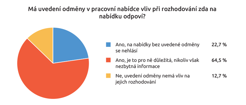 V otázce vlivu uvedení výše odměny v pracovním inzerátu na rozhodování dotyčného pak necelých 23 procent odpovědělo, že na nabídky bez této informace vůbec neodpovídá, pro 65 procent je to sice důležitá, nikoli však nezbytná informace.
