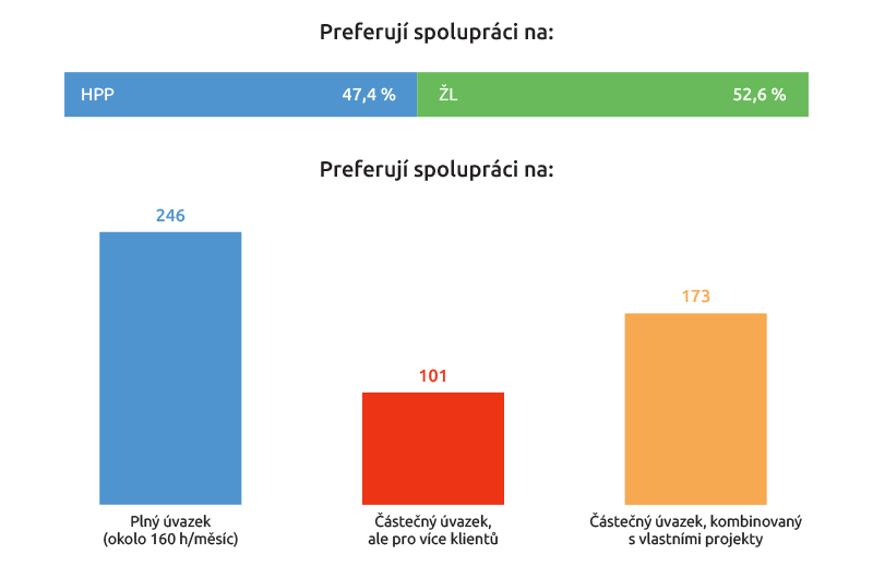 Opět mírně nadpoloviční většina upřednostňuje práci na živnostenský list (52,6 procenta), ovšem na plný úvazek.