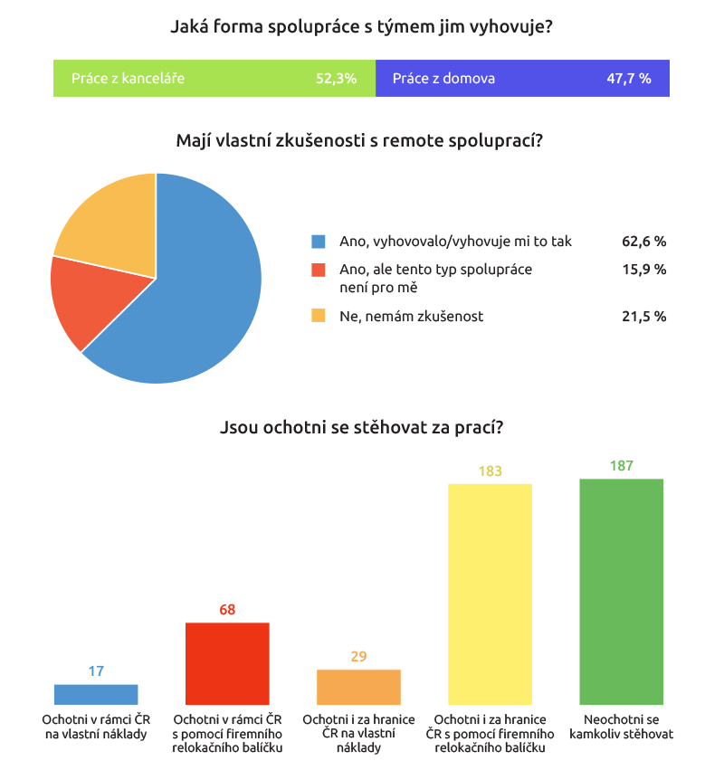 Pokud jde o ideální formu spolupráce, pak mírně nadpoloviční většina preferuje práci z kanceláře před remote modelem. Třebaže v otázce na zkušenosti s prací na dálku Přes 60 procent dotázaných uvedlo, že jim taková forma vyhovuje, pětina s ní vůbec nemá zkušenost a 16 procentům nevyhovuje.