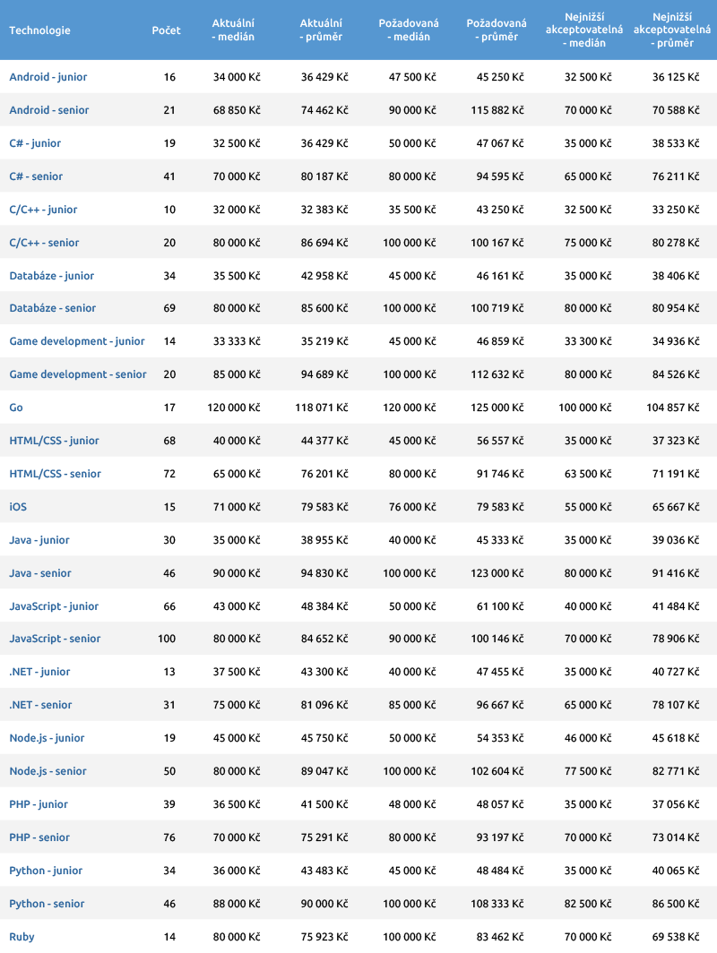 V následující tabulce pak můžete vidět, jaké jsou aktuální, požadované či nejnižší akcepotovatelné měsíční odměny v jednotlivých oborech, navíc rozdělené na seniorní a juniorní pracovníky: