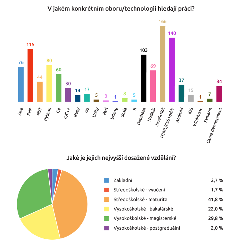 Z uživatelů, kteří se zúčastnili podzimního šetření, 409 lidí pracuje nebo shání práci v oboru IT - Vývojář. Největší počet z nich preferuje práci v JavaScriptu, HTML/CSS či PHP. Největší část respondentů (41,8 procenta) uvedlo jako nejvyšší dosažené vzdělání středoškolské s maturitou.