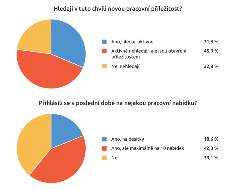 Bezmála polovina uvedla, že novou pracovní příležitost aktivně nehledá, ale je otevřena novým možnostem. Těchto tzv. pasivních kandidátů oproti loňsku značně ubylo (45,9 procenta letos vs 54,3 procenta loni). Oproti tomu přibylo těch, kteří se aktivně hlásí o novou práci (31,3 procenta letos vs 24,6 procenta loni), zatímco jen nepatrně vzrostl počet lidí, kteří jsou ve stávající práci spokojeni a změnu nehledají (22,8 procenta letos vs 21 procenta loni).