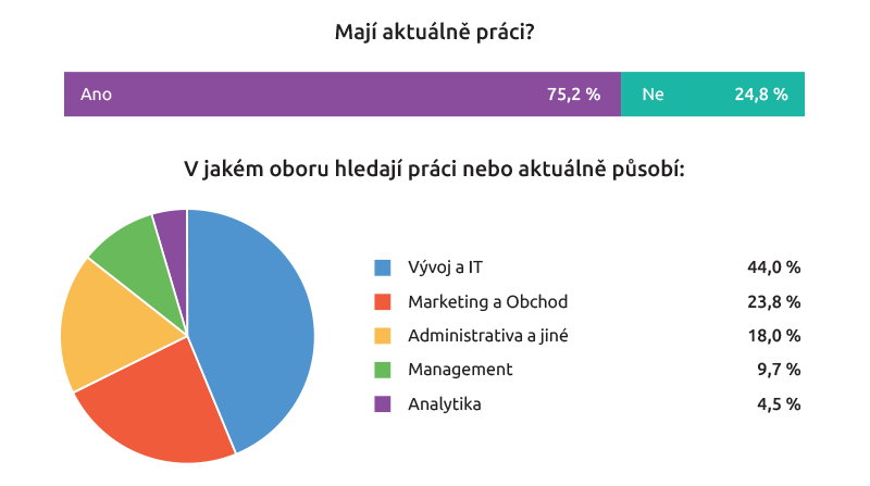 75,2 procenta respondentů odpovědělo, že má aktuálně práci, přičemž 44 procent odpovídajících se přihlásilo k oboru Vývoj a IT, 23,8 procent pak Marketing a Obchod. Největší nárůst oproti loňsku (ze 12 procent na 18 procent) evidujeme u administrativy.
