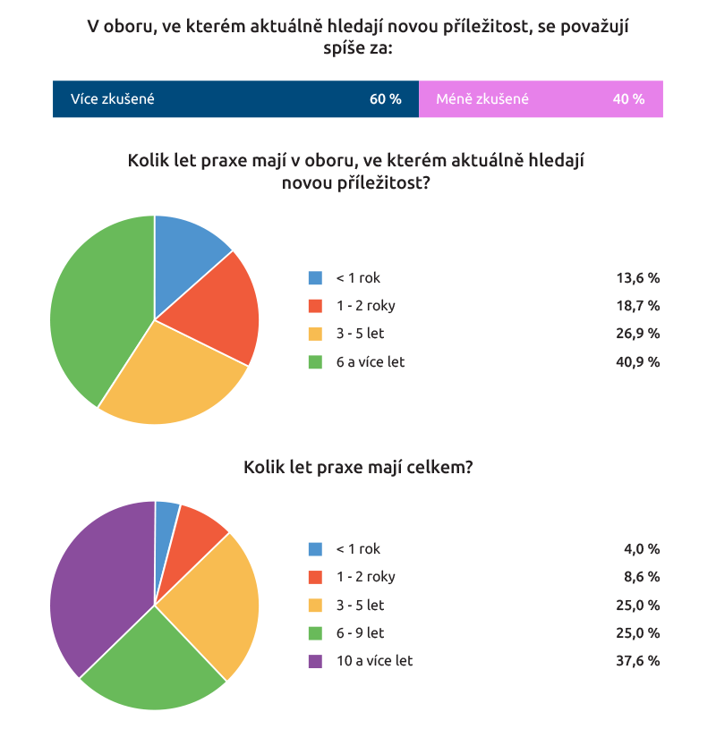 Stejně jako loni a předloni se většina ze zúčastněných (60 procent) považuje za zkušené pracovníky, 40,9 procenta z nich má přinejmenším šest let praxe ve svém oboru a deset či více let pracovních zkušeností vůbec (37,6 procenta).