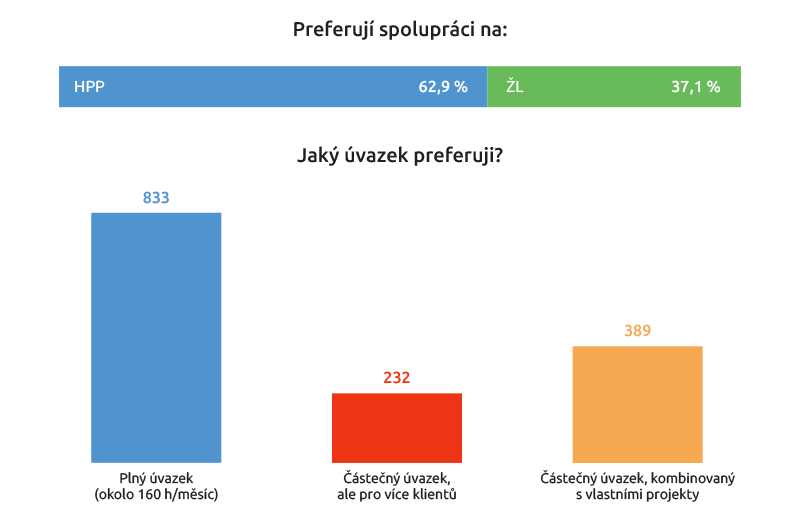 62,9 procenta preferuje práci na hlavní pracovní poměr, což je mírně více něž loni (60 procent), kdežto 833 dotázaných by volilo práci na plný úvazek, což představuje 68,6 procenta, tedy o necelé čtyři procentní body více než loni (64,3 procenta). Můžeme tedy říct, že lidé ještě více než v předchozích letech preferují stabilní pozici, což dokazuje i fakt, že ve srovnání s loňským rokem upouštějí od vlastních projektů při part-time (32 procent letos vs 36,7 procenta loni).
