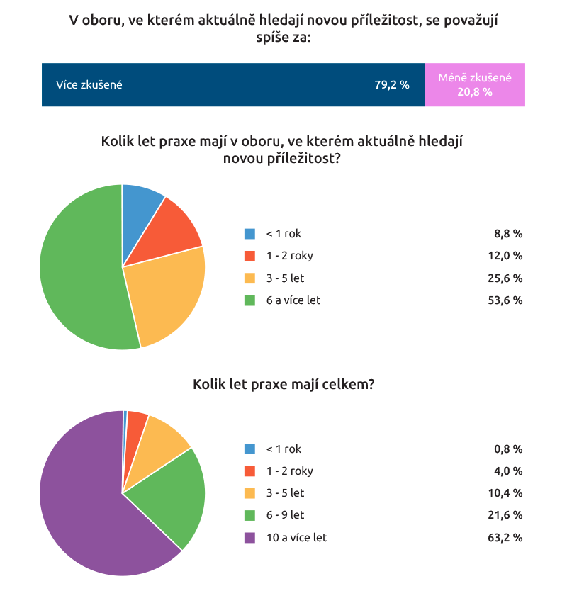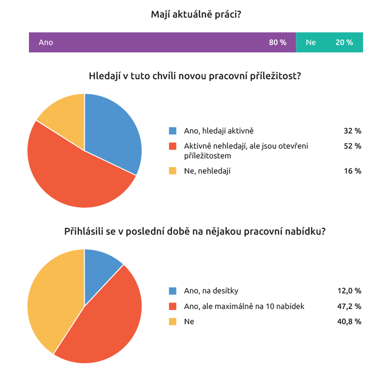 Většina z nich (80 procent) uvedla, že aktuálně práci má, přitom polovina sice aktivně nehledá, ale je otevřená případným nabídkám - stejný podíl v poslední době odpověděl na jednu až deset pracovních nabídek. Třetina zúčastněných aktuálně hledá práci aktivně, desetina respondentů odpověděla na desítky pracovních inzerátů.