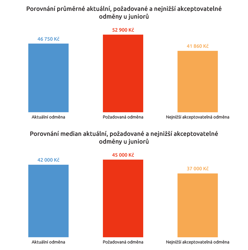 Jaké jsou platové představy manažerů? Junioři, kterých bylo v našem průzkumu minimum, uvedli, že si aktuálně přijdou v průměru na 46 750 Kč (v medianu 42 tisíc), a požadují 52 900 Kč (v medianu 45000). Nešli by pod 41 860 Kč, respektive 37 tisíc Kč.