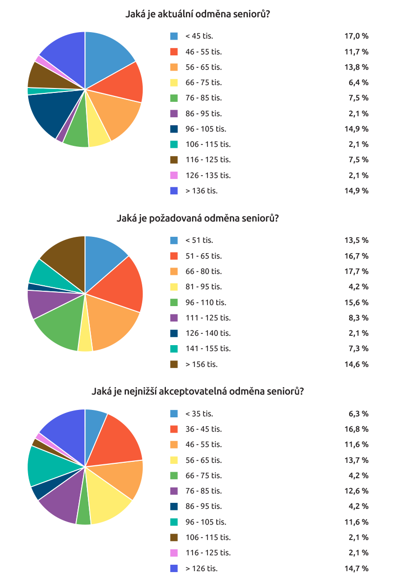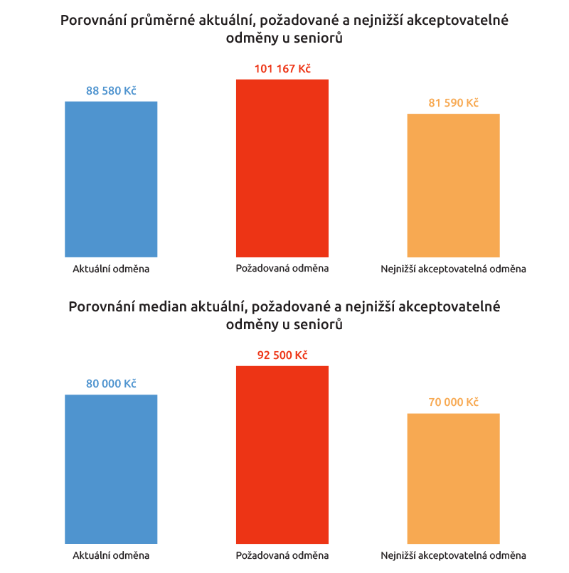 Seniorní manažeři průměrně dostávají 88 580 korun měsíčně (v medianu 80 tisíc Kč), ovšem požadují průměrně 101 167 tisíc korun (v medianu 92 500 Kč).