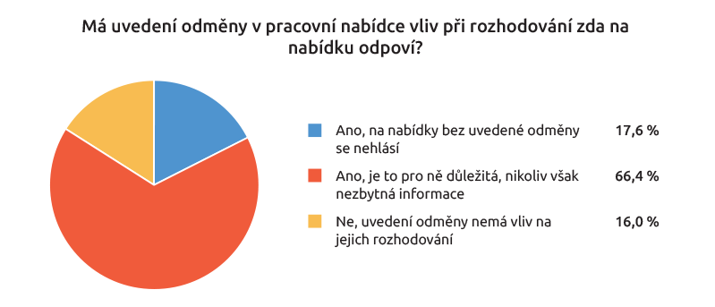 Uvedení odměny v pracovním inzerátů je pro ně přitom zásadní. Více než polovina z nich uvedla, že je pro ně tato položka důležitá, nikoli však nezbytná. Necelá pětina se na nabídky bez uvedené odměny vůbec nehlásí.