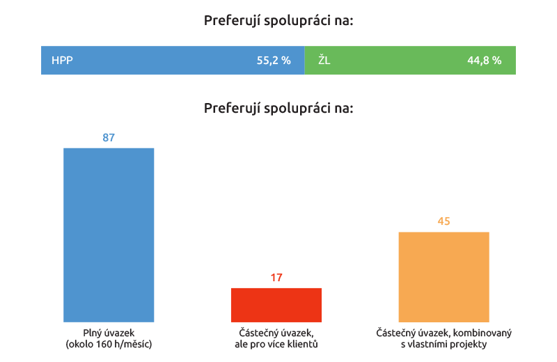 Lehce nadpoloviční většina preferuje práci na hlavní pracovní poměr, většina (87 z nich) plný úvazek.