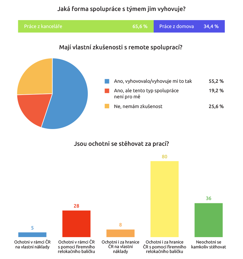 Naprostá většina (80 ze 125; odpovídající mohli zaškrtnout více možností) uvedla, že by byla ochotna se za prací stěhovat i do zahraničí, pokud by je firma podpořila relokačním balíčkem. 28 z nich by toto bylo ochotno podstoupit v rámci ČR, 36 by se nestěhovalo nikam.