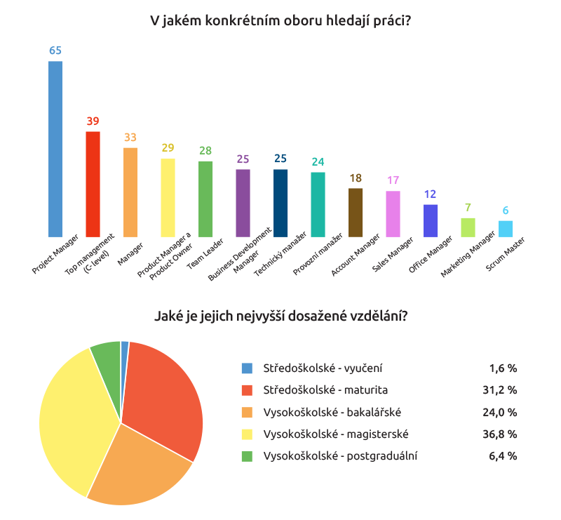 Manažeři mají nejčastěji v životopisu vysokoškolské magisterské vzdělání (36,8 procenta) či střední s maturitou (31,2 procenta). Nejvyhledávanější pozicí mezi nimi je Project manager (65 ze 125), následovaný Top managementem (39).