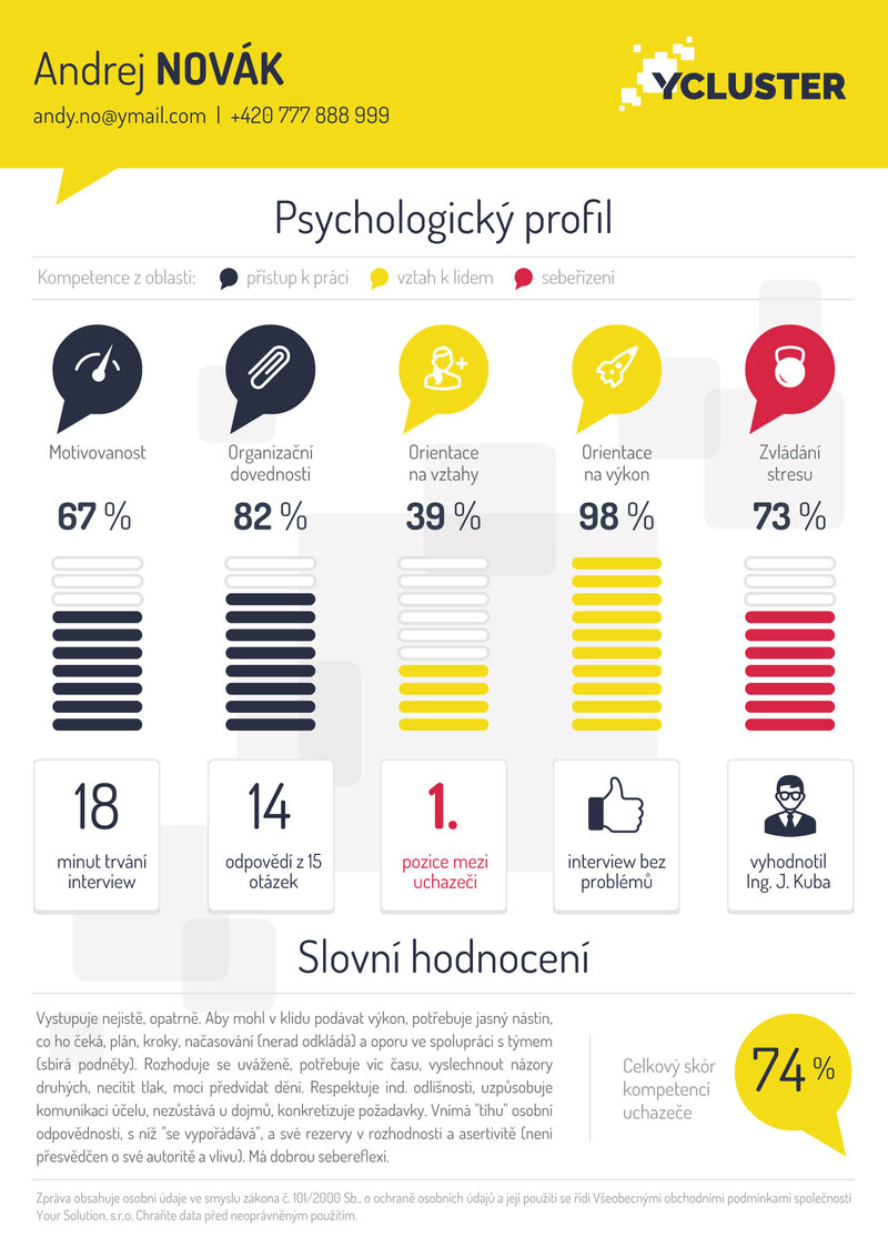 S kolegou Janem Kubou jsme nejdříve podnikali jako OSVČ, pod hlavičkou Your Solution. Od roku 2013 existuje naše firma Your Solution s.r.o., která dělá řadu věcí: klasickou psychodiagnostiku, pohovory, assessment centra, rozvojové programy, školení HR, koučování a taky jsme vyvinuli aplikaci na videodiagnostiku e-jobin. Tomu všemu jsme nyní dali souhrnný název Ycluster, abychom vystupovali jednotně. Jde o klastr psychologických služeb, který zahrnuje všechno, kde se protíná psychologie a práce. Počáteční „Y” symbolizuje řecké písmeno Ψ (psí), což je mezinárodně uznávaný znak pro psychologii.